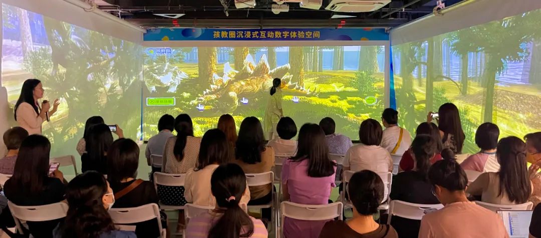 通过孩教圈老师的讲解和演示,大家了解到孩教圈沉浸式数字互动教室融合了“互动多媒体、3D、裸眼全息、人机智能交互”等技术,将动画画面投射到地面或墙面,并通过触摸雷达互动、体感动作捕捉、红外线感应等技术实现人与动态画面的实时交互,营造身临其境般的沉浸式场景,让孩子仿佛置身于各种真实场景中,进行情景式、沉浸式、交互式、游戏式的数字化教育内容。